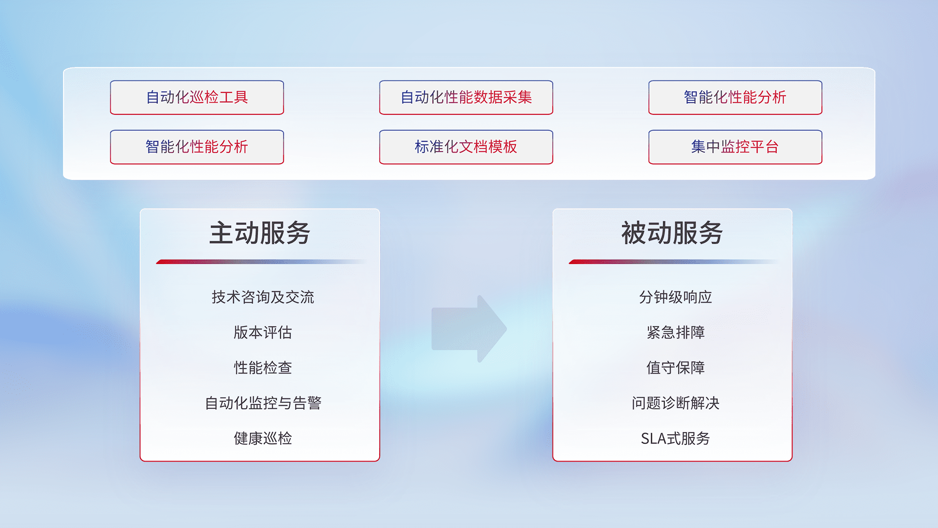 智能化工具和标准化文档,,保障服务质量,,提供主动服务(包含技术咨询、、、版本评估、、性能检查、、、自动化监控与告警、、、健康巡检)和被动服务包含(分钟级响应、、、、紧急排障、、、值守保障、、、问题诊断解决、、、SLA服务)。。。。